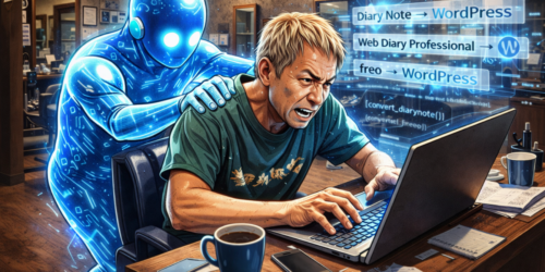 2026年2月10日 10年分の過去ブログを生成AIでワードプレスに変換と復元!1000時間の手作業を数時間に変えた全記録 2026年2月10日(火) 当店のブログは、気づけば足かけ20年ほど続いています。 これまで使ってきたウェブログシステム... カテゴリー WEBシステムの変更/店主の独り言